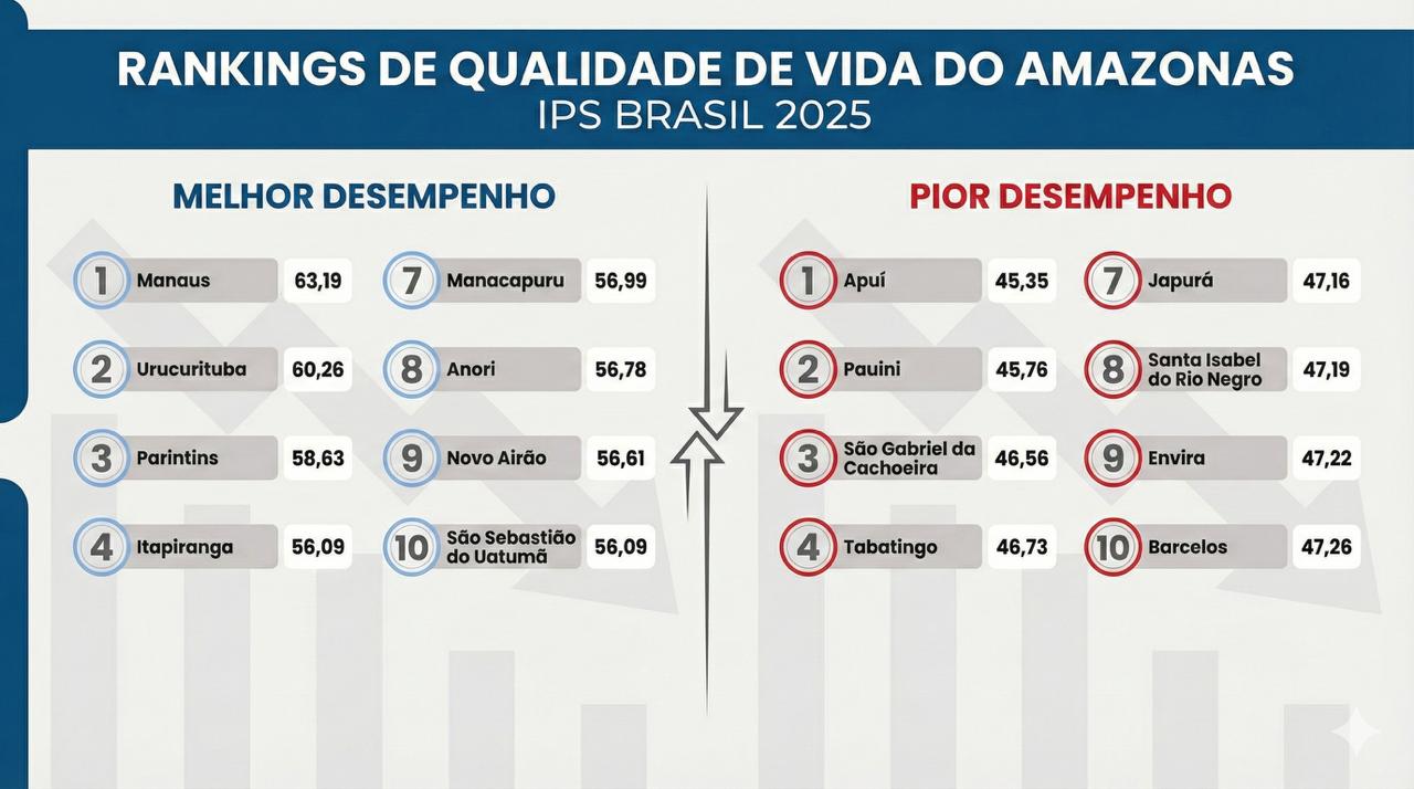 Municípios amazônicos com maior distância de centros urbanos e baixa densidade populacional tendem a apresentar desempenhos mais fracos, destacando desigualdades estruturais na qualidade de vida e acesso a serviços básicos no interior do estado, conforme a classificação do IPS Brasil 2025.