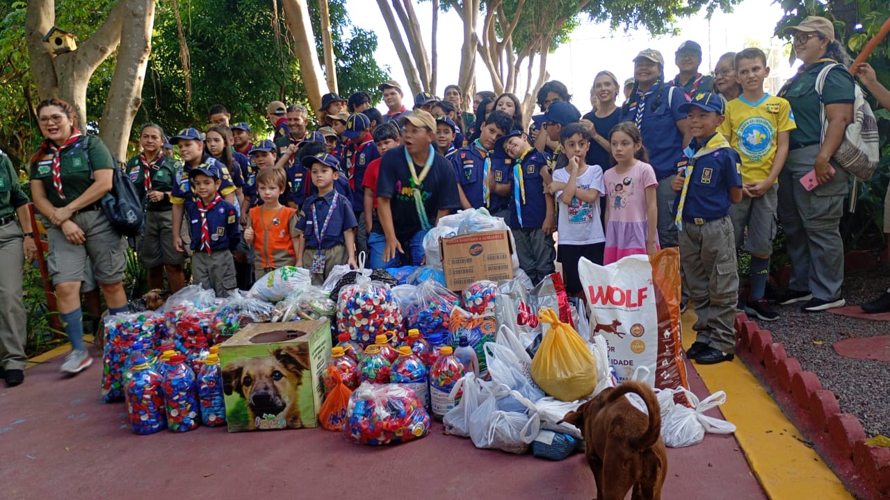 Durante a visita, os escoteiros entregaram tampas plásticas e ração arrecadadas em parceria com o projeto social Amazon Eco Pet, como apoio às ações de cuidado animal realizadas pela secretaria.