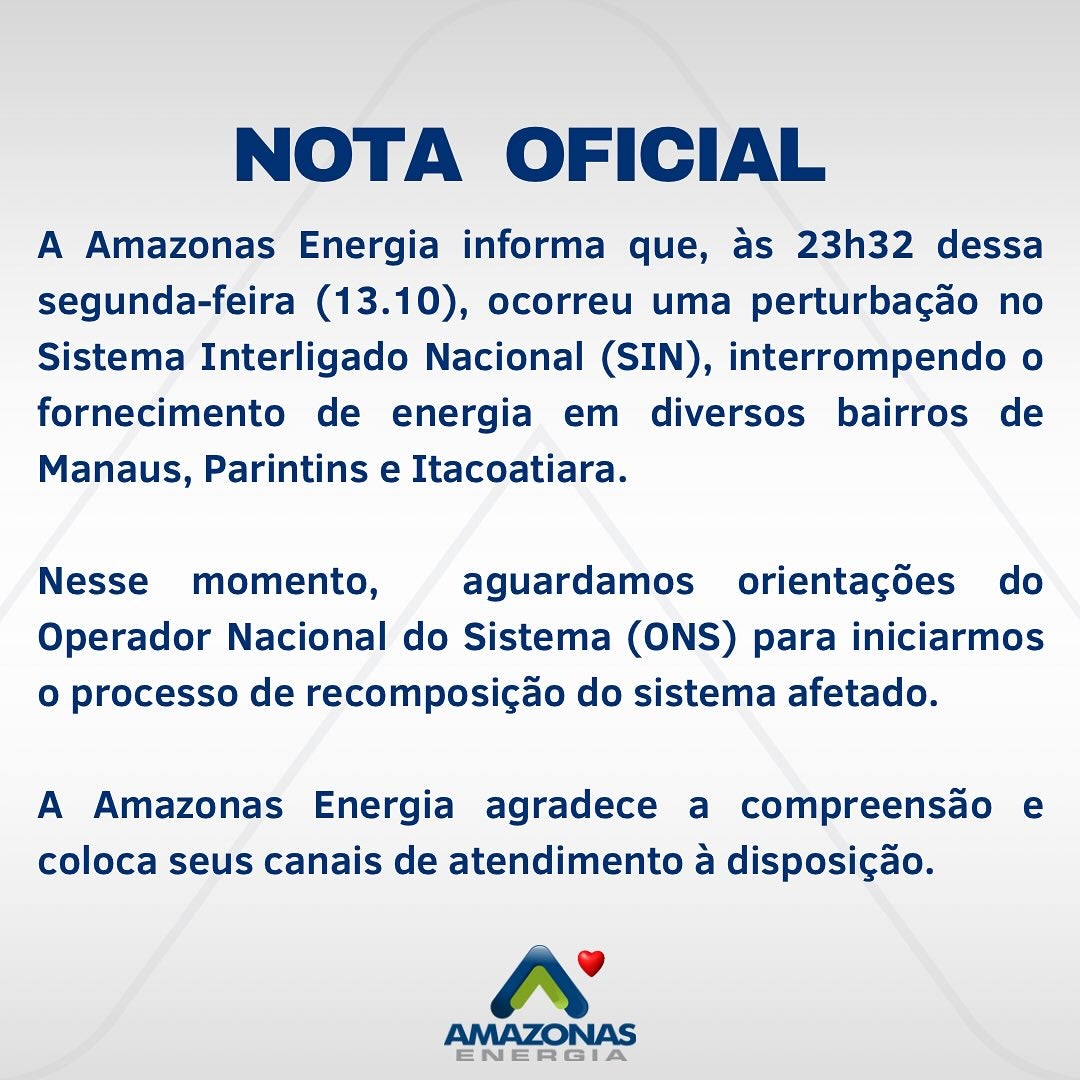 A Amazonas Energia e o Operador Nacional do Sistema Elétrico (ONS) divulgaram notas detalhando a causa do apagão e as ações realizadas para restabelecer o fornecimento de energia.