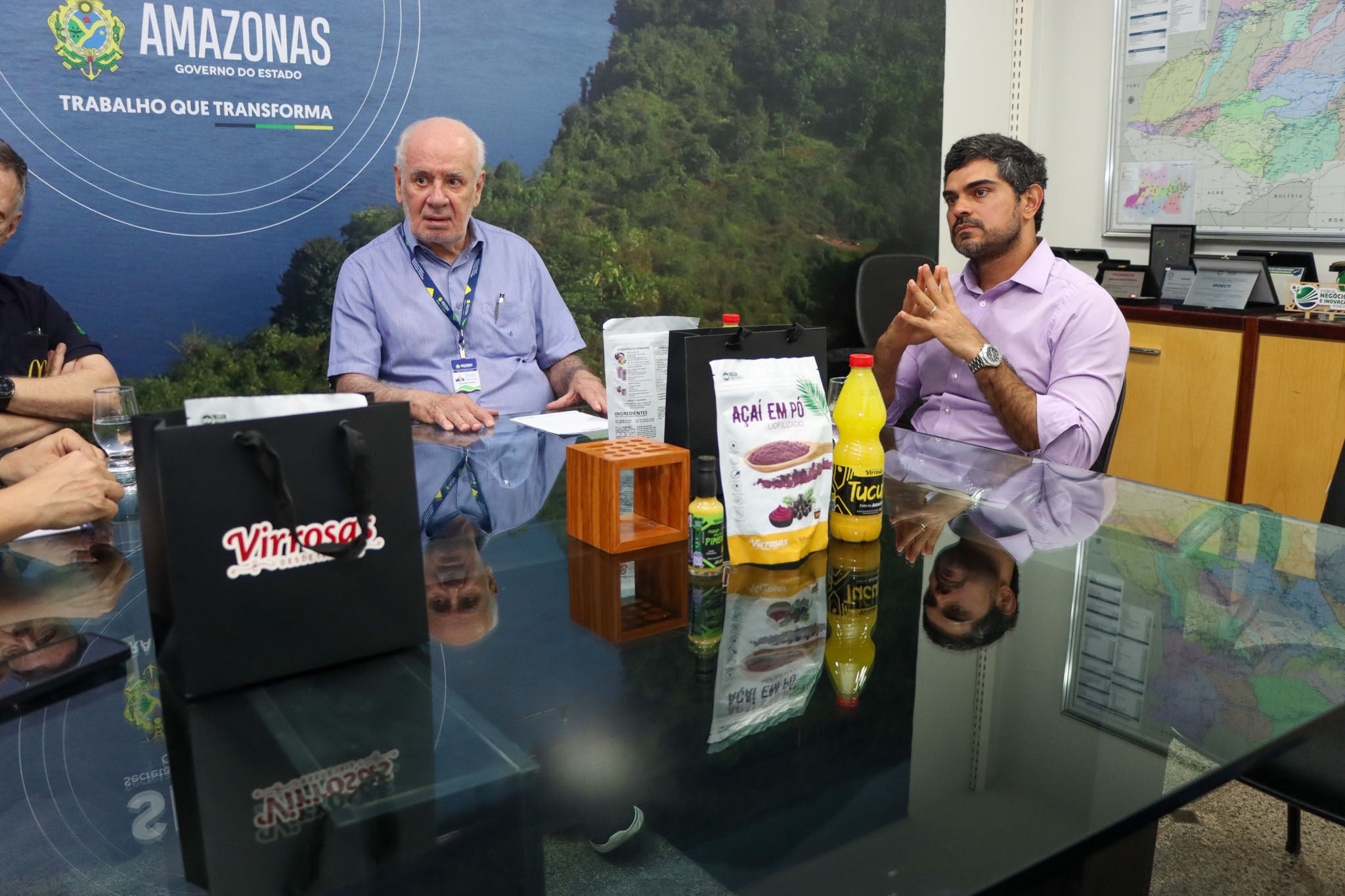 A bioeconomia voltou ao centro das discussões sobre desenvolvimento no Amazonas. Nesta terça-feira, 3, o secretário de Desenvolvimento Econômico, Ciência, Tecnologia e Inovação, Serafim Corrêa, recebeu o presidente do Sindicato das Indústrias de Alimentação de Manaus (Siam), Pedro Monteiro, e o empresário do setor alimentício Sérgio Band para tratar de projetos voltados à produção regional.