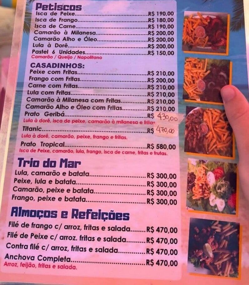 Também circulou a imagem de um cardápio atribuído a uma praia de Búzios (RJ), com preços como R$ 190 por uma porção de isca de peixe, R$ 150 por seis unidades de pastel e R$ 200 por camarão à milanesa.