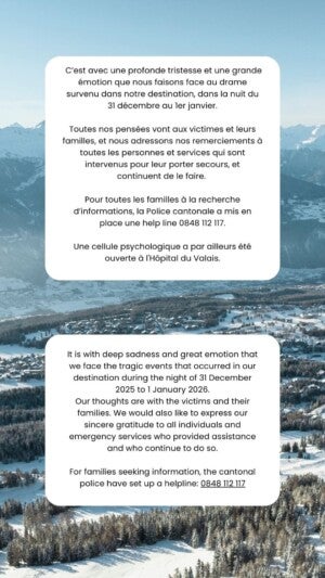 O resort de Crans-Montana divulgou uma nota lamentando a tragédia. A estação de esqui costuma ser frequentada por jovens e estrangeiros no fim de ano.