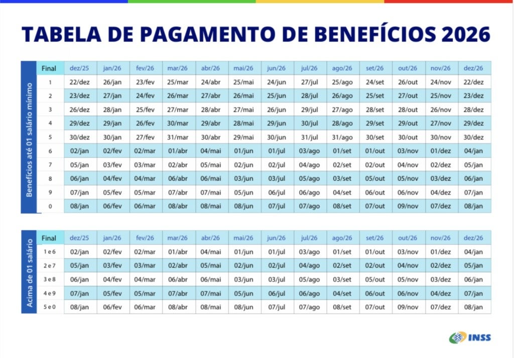 Os benefícios referentes a janeiro de 2026 serão pagos entre 26 de janeiro e 6 de fevereiro para quem recebe um salário mínimo. Para segurados com renda superior ao piso nacional, os depósitos ocorrem de 2 a 6 de fevereiro.