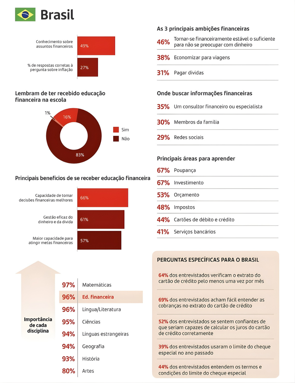 Embora a participação em cursos formais ainda seja limitada, o Brasil aparece acima da média global. 27% dos brasileiros afirmaram já ter realizado algum curso de educação financeira, ante 20% no conjunto dos países pesquisados. Entre os benefícios apontados estão a melhora na tomada de decisões financeiras (66%), maior controle de recursos e dívidas (57%) e organização do orçamento doméstico (61%).