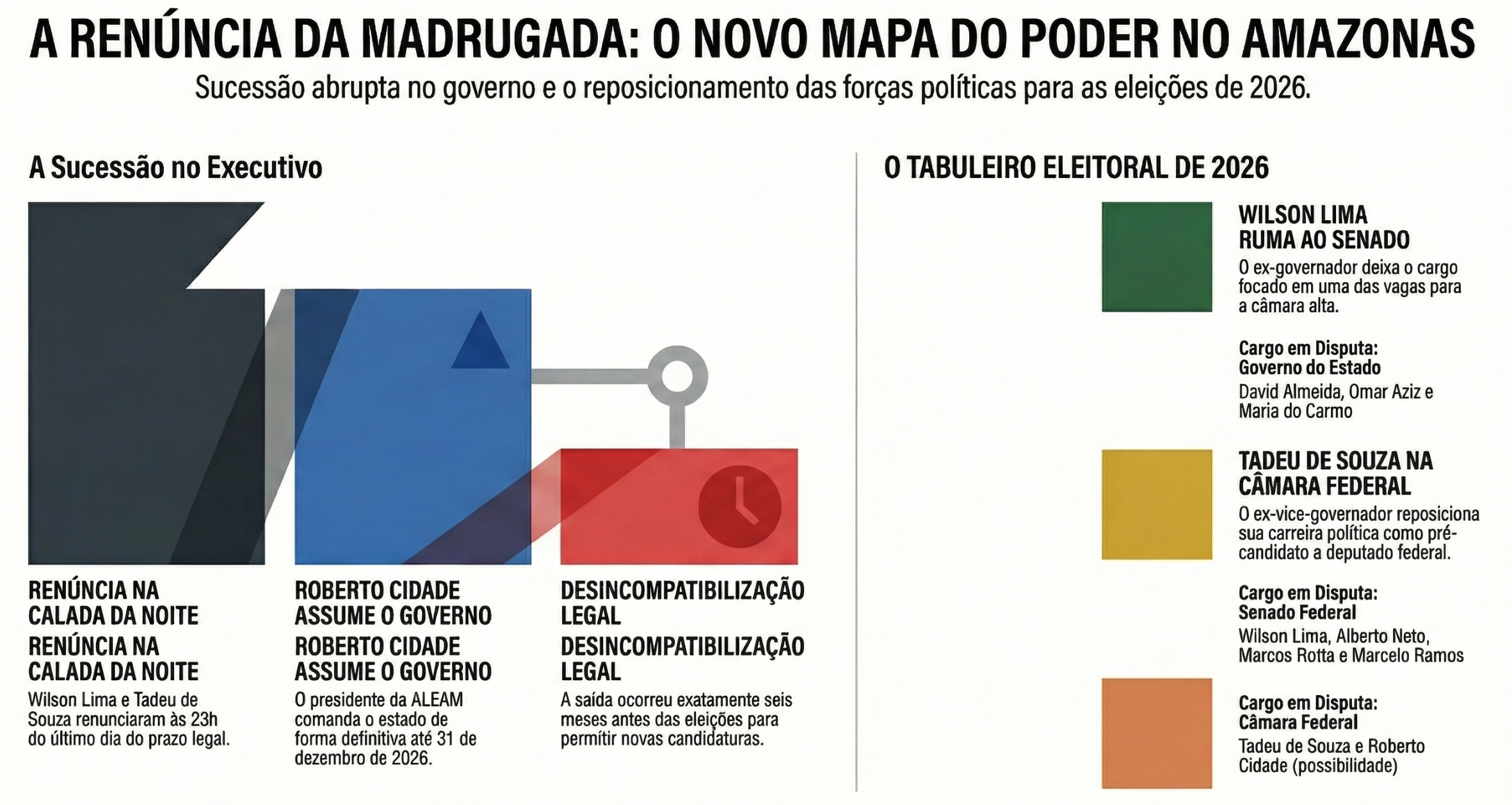 Com a renúncia, o tabuleiro político estadual é oficialmente redesenhado. A corrida pelo governo do Amazonas se intensifica e já conta com nomes que despontam como pré-candidatos, entre eles: