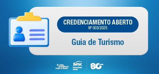 O Sesc Amazonas está com inscrições abertas para o credenciamento de guias de turismo, pessoas físicas ou jurídicas, para atuação nos roteiros turísticos elaborados pela instituição. O credenciamento terá validade de três anos e contempla atividades no Amazonas e em outras regiões do Brasil.